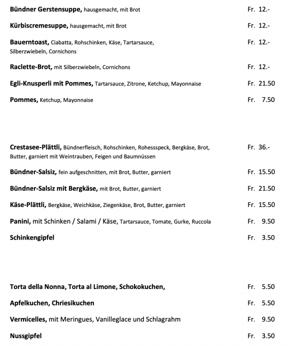 Der Kiosk am Crestasee bietet Ihnen verschiedene warme Speisen, wie Fischknusperli, Raclette, Bündner Gerstensuppe, Snacks sowie verschiedene Glaces und Softdrinks zur Erfrischung an. Ebenfalls verfügt der Kiosk auch über eine Kaffeemaschine und verschiedene alkoholische Getränke.